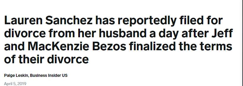 Via businessinsider.sg; 贝佐斯与前妻敲定离婚协议后一天,劳伦⋅桑切斯与怀特塞尔⋅帕特里克就申请离婚了