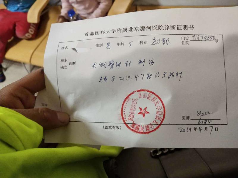 由于清明节期间彬彬没在北京,彬彬妈妈没有随其他几个孩子家长一起去报警,也没有去医院验伤,据已经验伤的几位家长说,他们报警后,警方让他们带着孩子去附近医院验伤。经通州区潞河医院医生的检查,已经有四名孩子开出了诊断证明,四个孩子在手部、面部、臀部都发现了针刺伤。