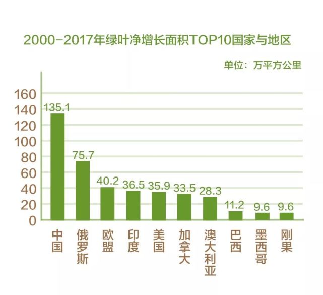 2018年,美国国家航空航天局公布的一份研究报告显示,2000-2017年,地球新增的绿叶面积(植物叶片总面积)相当于多出一块亚马逊雨林。中国的绿叶净增长面积居全球首位,达135.1万平方公里,几乎相当于俄罗斯、美国和加拿大绿叶净增长面积的总和,占据了全球绿叶净增长面积的四分之一,其贡献42%来自于植树造林。
