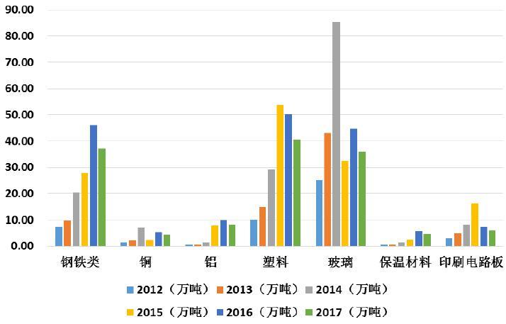 2012-2017年废弃电器电子产品资源回收重量(万吨)。图片来源:《中国废弃电器电子产品回收处理及综合利用行业白皮书2017》
