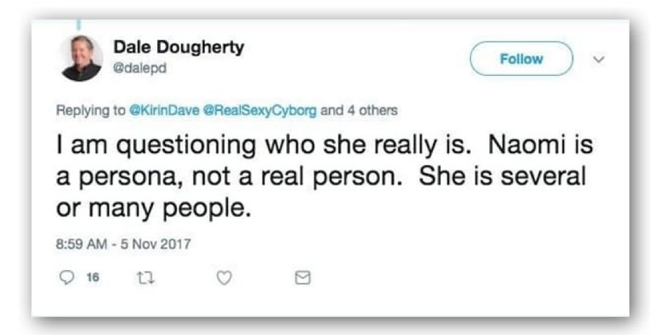 2017年,Naomi遭到了一位非常有影响力的创客——Dale Dougherty(“创客运动的教父”)的质疑和批评,Dale在Twitter上公开质疑Naomi是假的,SexyCyborg频道是一个骗局,这一切都是背后有白人男子在操控。