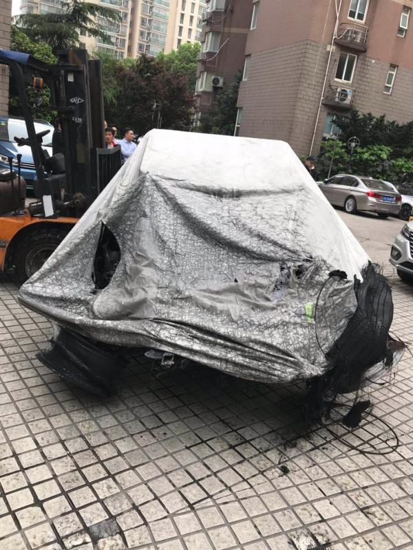 4月23日,被烧损的特斯拉轿车准备运离小区。 网友供图