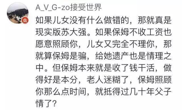 “保姆在家里服务了六、七年。几年前老伴生病卧床,包括吃喝拉撒睡在内的各种照料,大部分都由保姆承担,持续到老伴过世,她始终任劳任怨、贴心照顾。老伴过世后,保姆又一直无微不至地照顾自己。而自己的儿女要么在外地,要么忙于工作或家庭,顾不上他。