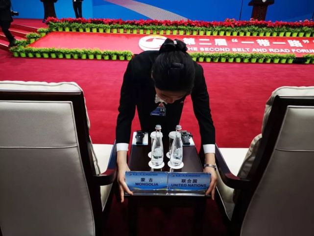 工作人员正在布置出席开幕式领导人的座位。(央视记者史伟拍摄)