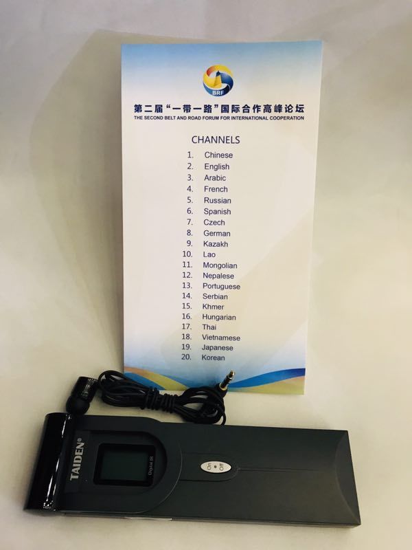 这是开幕式配备的同传耳机,为现场嘉宾提供20种语言的同传服务。(央视记者钟锋拍摄)