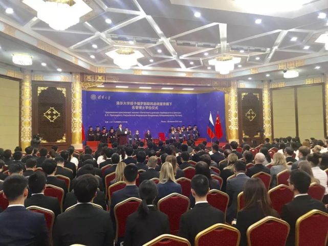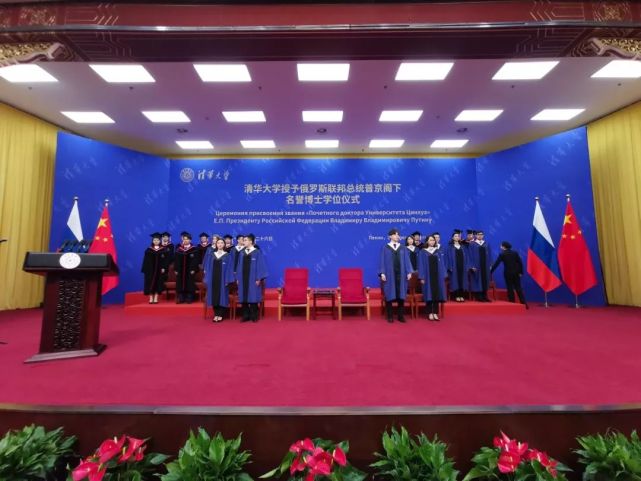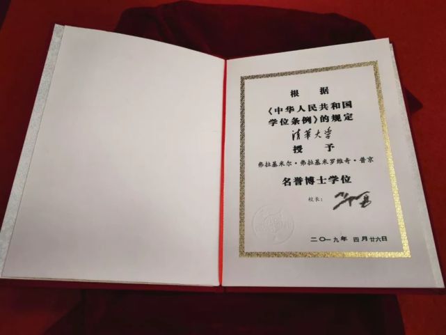 清华大学在这里为普京举行了隆重的仪式,授予他名誉博士学位。