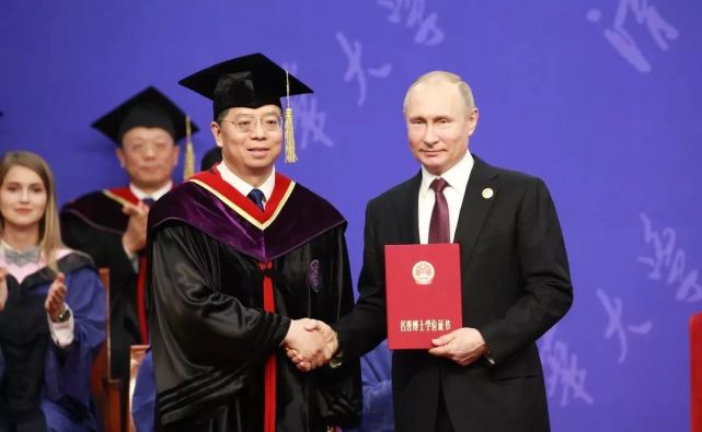 在习近平主席见证下,清华大学校长邱勇向普京总统颁发了名誉博士证书。普京在接受证书时说:清华大学是举世闻名的大学,也是习近平主席的母校,培养了很多优秀人才。今天,在我的好朋友习近平主席见证下,清华大学向我授予名誉博士学位并举行隆重仪式,我感到很荣幸,也深受感动。