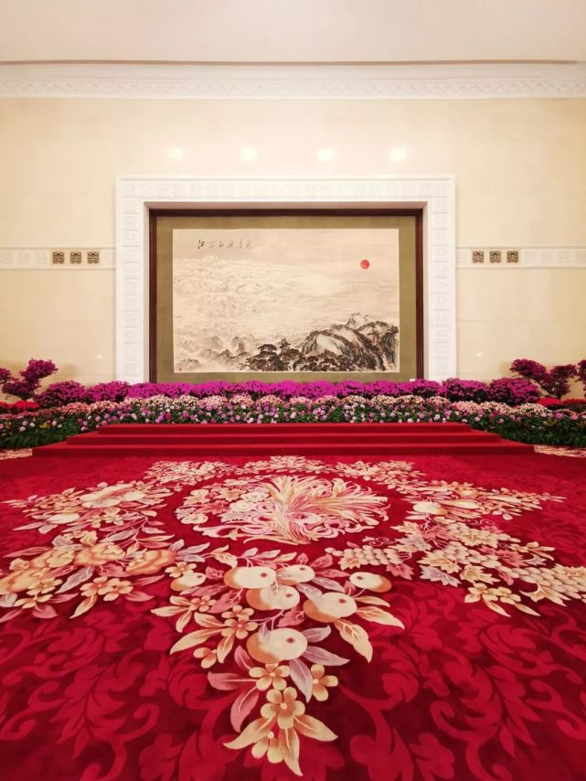 迎宾仪式在人民大会堂二层巨幅山水画《江山如此多娇》前举行。《江山如此多娇》是中国当代画家傅抱石和关山月以毛泽东的《沁园春·雪》为题材,于1959年合作创作的。(央视记者张晓鹏拍摄)
