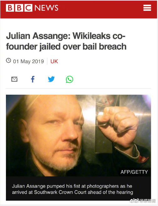 【维基解密创始人阿桑奇被判入狱服刑50周】据BBC消息,维基解密创始人阿桑奇被英国伦敦法庭判刑入狱服刑50周。4月11日,厄瓜多尔撤销了对“维基解密”创始人阿桑奇的政治庇护,随后,英国警方在厄瓜多尔驻英国大使馆逮捕了阿桑奇。阿桑奇创办的“维基解密”网站在2010年公布了美国阿富汗战争和伊拉克战争的秘密文件。阿桑奇于2012年6月19日进入厄瓜多尔驻伦敦大使馆申请政治避难,获得庇护后一直躲在大使馆内。via环球时报