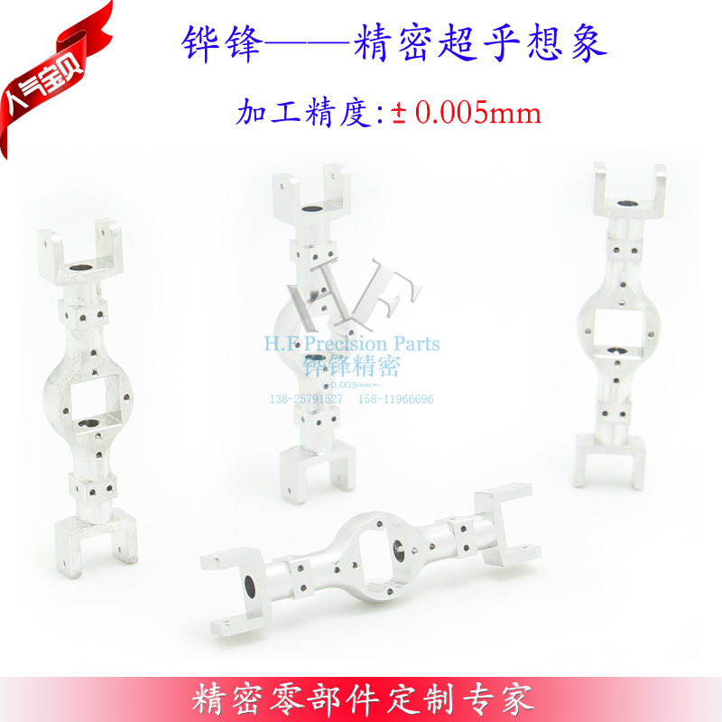 惠州铧锋精密五金加工厂,专业定制各类精密零件,您可以来图、来样、甚至只画一份草图,或者打电话和我们边沟通,我们工程师边帮您画图等等方式来订制您想要的精密零件,铧锋只制作精密零件,普通的零件建议不要找铧锋来定制,此款产品是汽车模型的前后桥,整个汽车模型中,前后桥的制作难度是最大的,产品长达到了90mm,复杂,前后轴承孔,侧面钻孔攻丝,铣扁位等等,此产品最大的难度在于两端的轴承孔如何保证,并且产品采用7系航空铝材制作,硬度高,铧锋用6轴车铣钻带有端铣的复合设备加工,一次成型,并且配有专门的深孔钻座,不但保证了孔的同心度,而且双主轴的优势保证了产品的两个轴承孔的同心,产品在完成后,深得客户的赞扬,铧锋精密欢迎广大客户前来定制洽谈!