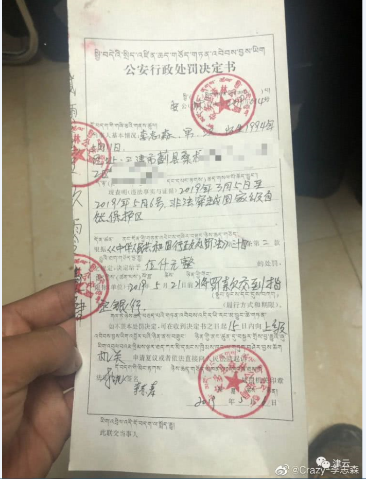 西藏林业厅曾于2017年4月发布禁止在羌塘组织非法穿越的公告,李志森奉劝大家吸取教训,“太多人冒着生命危险深入无人区”,现在李志森和同伴正在配合相关单位进行调查,5月6日,他们三人被安多县森林公安局处以每人5000的罚款。