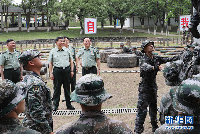 5月21日,中共中央总书记、国家主席、中央军委主席习近平到陆军步兵学院视察。这是习近平观看学员进行极限训练。新华社记者 李刚 摄
