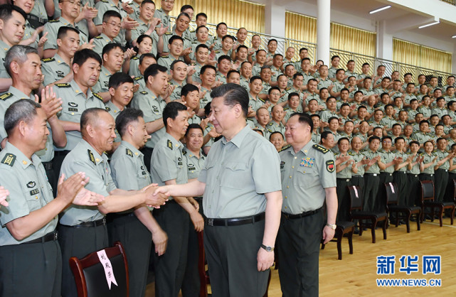 5月21日,中共中央总书记、国家主席、中央军委主席习近平到陆军步兵学院视察。这是习近平亲切接见驻江西部队副师职以上领导干部和建制团级单位主官、陆军步兵学院本部正团职以上干部和石家庄校区主官、专家教授代表。新华社记者 李刚 摄