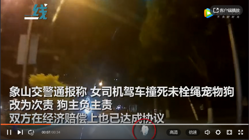 女车主驾车撞死未拴绳宠物狗负全责 交警:改判车主次责狗主主责