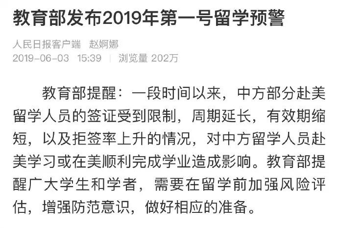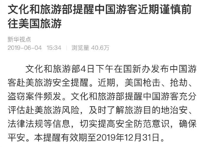 先是6月3日下午,教育部发布2019年1号留学预警“提醒广大学生学者出国留学前加强风险评估”;后有文化和旅游部提醒中国游客“充分评估赴美旅游风险”;稍晚,外交部和中国驻美使领馆又添重料:“提醒赴美国中国公民和在美国中资机构提高安全意识,妥善积极应对”。