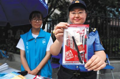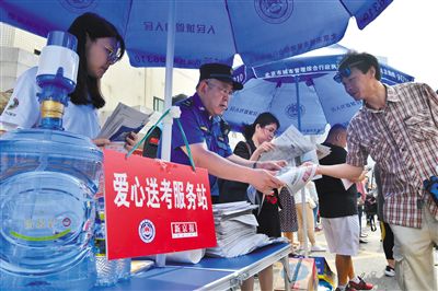 昨天上午,在东城、西城、朝阳、通州、石景山等各区考点现场,都有城管队员们值守在考场外,提供“爱心”服务的身影。记者在广渠门中学考点看到,东城城管执法人员早上7点就来到现场撑起遮阳伞、搭起桌子,为考生和家长准备了扇子、饮用水及2B铅笔、橡皮等考试用品,一旁的应急药箱内还备有风油精、创可贴等。东城城管东花市执法队教导员蒋蕊告诉记者,自己当年也是在这个考点参加高考的考生,如今能在这里参与服务保障工作感慨万千,“就想尽我们所能,为广大学子迈向人生重要一步提供一点微小的帮助。”