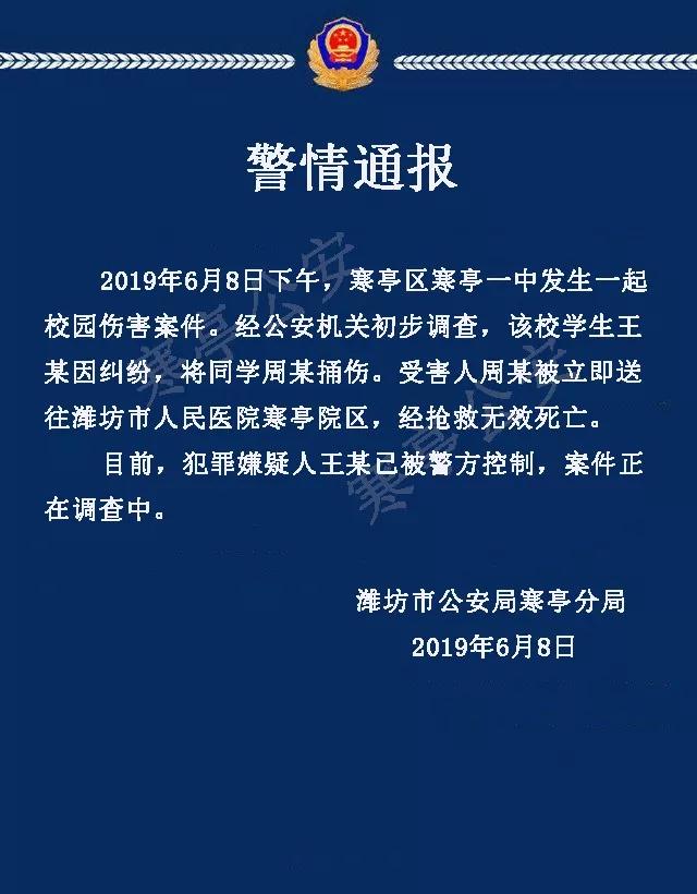 新京报快讯 据潍坊市公安局寒亭分局微信公众号消息,6月8日下午,寒亭区寒亭一中发生一起校园伤害案件。一学生因纠纷将其同学捅伤,受害人经抢救无效死亡。潍坊市公安局寒亭分局随后在其微信公众号对这起案件进行了通报,通报全文如下: