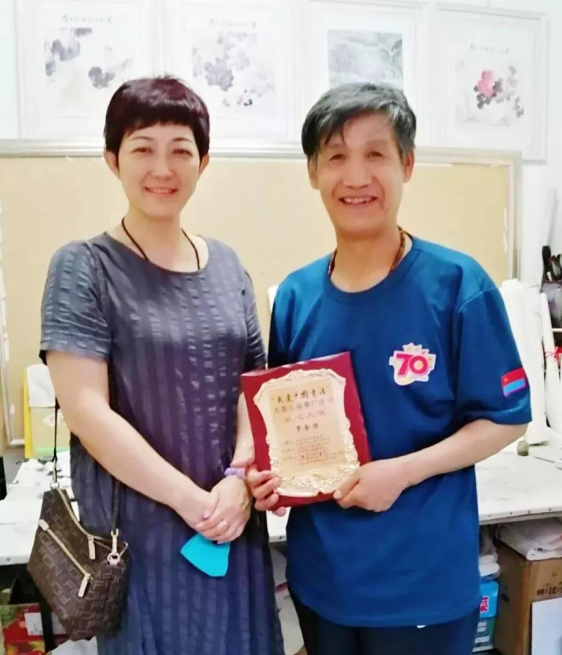 陈家芝主席(左)为“我爱中国书法”公益推广活动担当爱心大使,河北省老教授协会秘书长徐将林先生(右)为其颁发爱心牌。