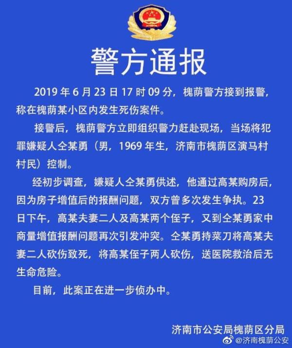6月23日17时许,济南槐荫警方接到报警,称在槐荫某小区内发生死伤案件。经初步调查,高某夫妻二人及两个侄子,到犯罪嫌疑人仝某勇家中再次商量房屋增值报酬问题引发冲突,仝某勇持菜刀将高某夫妻二人砍伤致死,将高某侄子二人砍伤,送医救治后无生命危险。