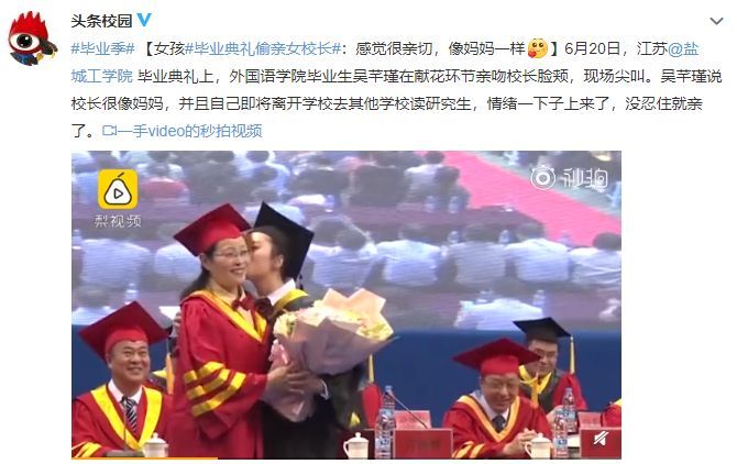 也是在同一天,江苏盐城工学院毕业典礼上一名女生在献花环节亲吻了女校长,因为她觉得校长很像妈妈,自己也即将离开学校到外校读研,“情绪一下子上来,没忍住就亲了”。