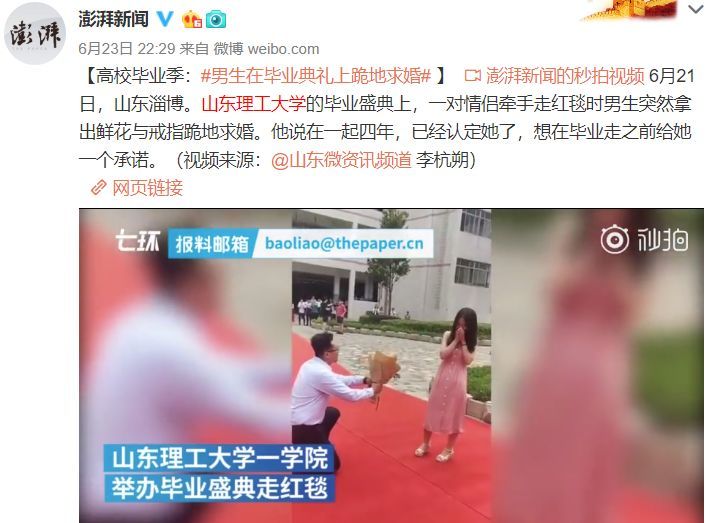 在今年山东理工大学的毕业盛典上,一对情侣牵手走红毯时,男生突然拿出鲜花与戒指,向女生单膝跪地求婚。