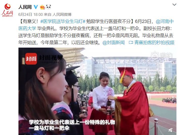 而河南中医药大学则为毕业生代表送上一盏马灯和一把伞。副校长称,送学生马灯是鼓励学生不分昼夜看病,一把伞则是风雨无阻的寓意。