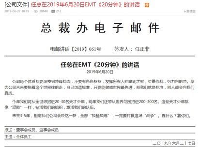 6月27日,华为心声社区发布的总裁办电子邮件披露了任正非在EMT《20分钟》的讲话,“公司每个体系都要调整到冲锋状态,不要有条条框框,发挥所有人的聪明才智,英勇作战,努力向前冲。华为公司未来要拖着这个世界往前走,自己创造标准,只要能做成世界最先进,那我们就是标准,别人都会向我们靠拢。”