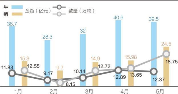 今年前5月我国猪肉及牛肉进口数量及金额数据来源:海关总署杨靖制图