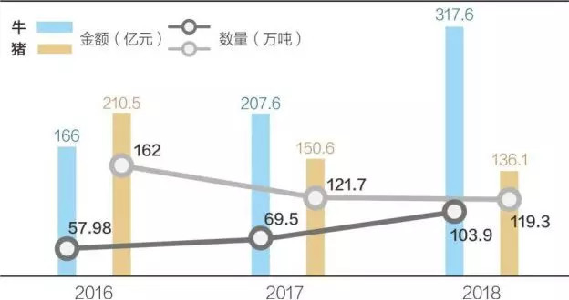 近3年来我国牛肉及猪肉进口数量及金额数据来源:海关总署杨靖制图