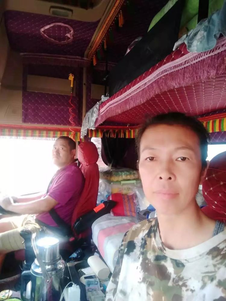 我们驾驶室不到 6 平方米,上下两层卧铺不到 90 公分长,前面是两个座位。最大的活动空间就是在卧铺上面躺一躺。