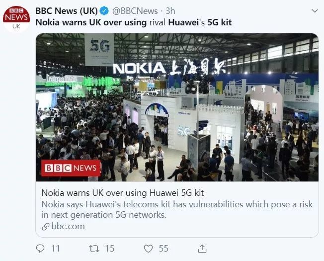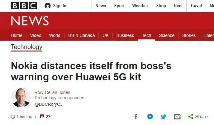 昨天上午,英国BBC先是发布了一篇名为“诺基亚警告英国不要用华为5G设备”的报道,称诺基亚公司的首席技术官(CTO)马库斯·韦尔登(Marcus Weldon)表示华为公司的5G设备并不安全,存在安全漏洞,会给5G网络带来风险。