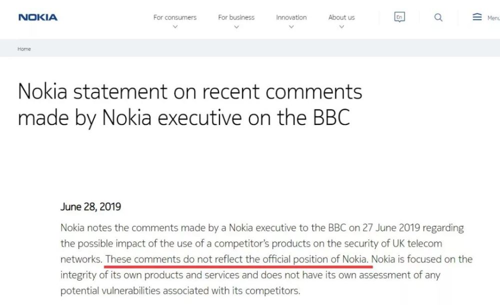 但有趣的是,在这篇报道发布后没多久,诺基亚方面就紧急澄清了这位公司资深高管的言论,在诺基亚的官网和发给媒体的回应中都强调他的言论“不代表公司的官方立场”。