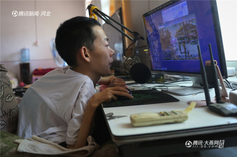 在网络上,刘帅飞搜索着一切能赚钱的方法,不经意间,一条代练的消息出现在他眼前。“这个方法不错”,刘帅飞说,“我一开始通过一个游戏平台注册了5个账号,通过做任务赚金币。”一天下来,他把游戏里的虚拟货币转手卖掉,大约能赚一两百元。“我不想因为这个病成为家里的拖累。”刘帅飞每天至少会工作9个小时。冬天还好,有较厚的衣服可以帮他固定身体。到了夏天,天气热衣服有薄,他坐一会就会感觉到全身不适。即便如此,他稍微活动下还会继续工作。