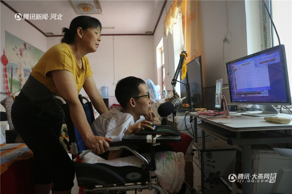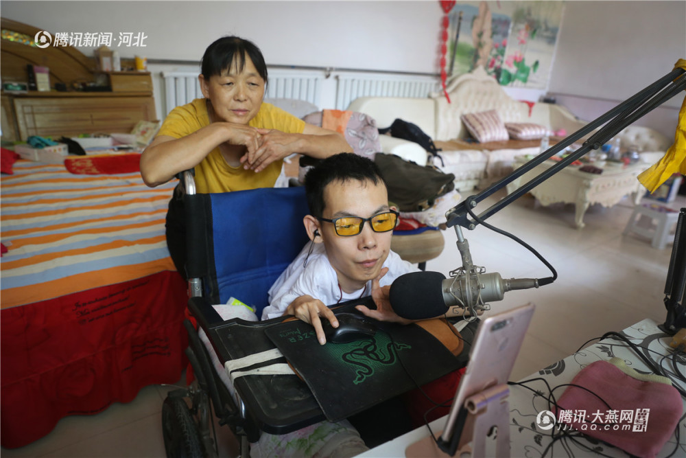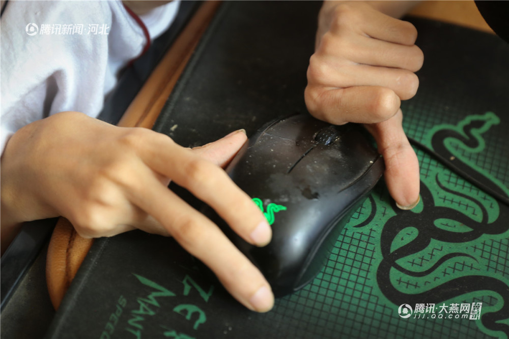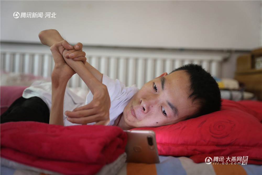 从小刘帅飞就知道自己和别人不一样,随着年龄的增长,他从最开始的无法走路逐渐变得全身都无法动弹,全身骨头都已弯曲变形。家人带着他四处寻医问药,跑遍了河北、山西、北京……然而他的病还是不见起色。图:刘帅飞用两只手的4根手指控制鼠标。