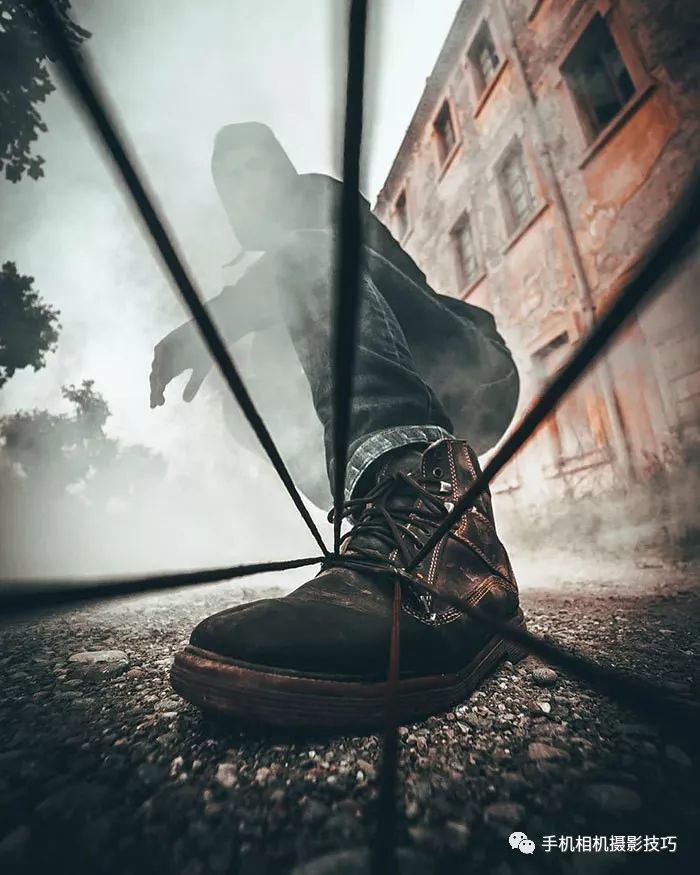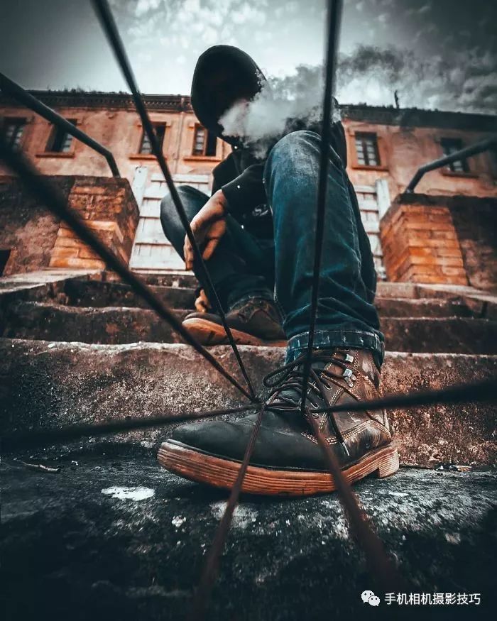 手拉鞋带,延伸至镜头前,模特摆一摆酷酷的姿势,就能拍出十分有创意的一张照片。