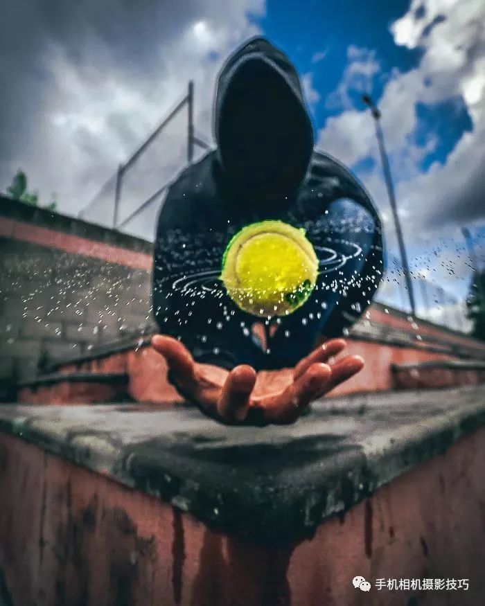 首先使用网球,在上面撒上一些水,然后,在镜头前将网球上抛并快速转动,可以看到有趣的水痕就被记录下来了。