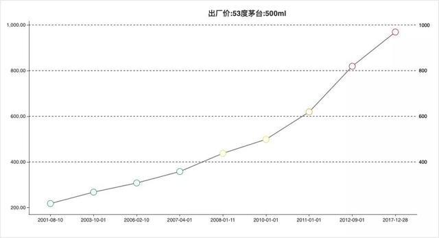 茅台也开启了自己的黄金时代。这十年间,茅台的出厂价先后上调八次,从2002年的218元一路涨至2012年的819元,零售价从280元左右飙升到2000元。