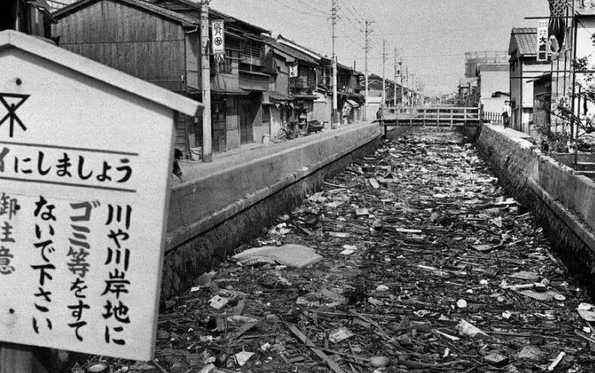 (图:1967年,日本大阪被垃圾塞满的河流。)