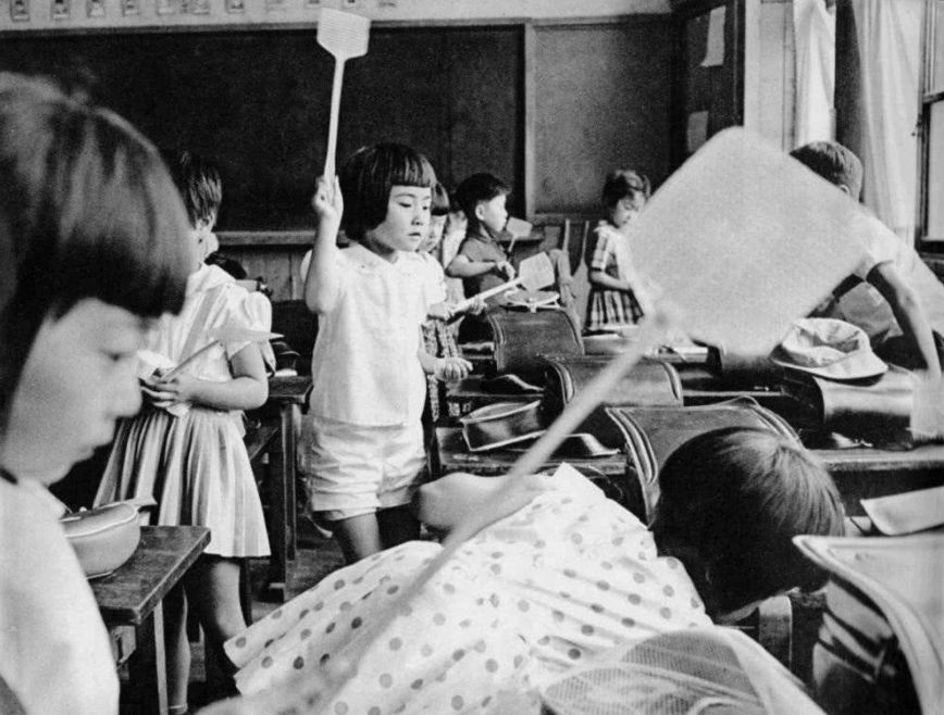 (图:1965 年夏天,江东区南砂汀小学的学生们,在课后纷纷掏出苍蝇拍打苍蝇的情景。)