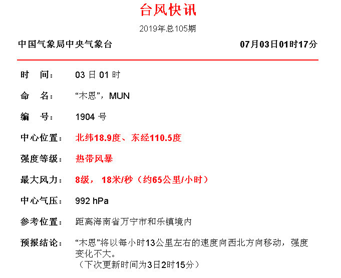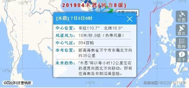 今年第4号台风"木恩"中心已于3日00时45分前后在海南省万宁市和乐镇沿海登陆,登陆时强度为热带风暴级,中心附近最大风力8级(18米/秒),中心最低气压992百帕。