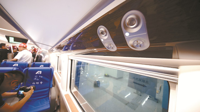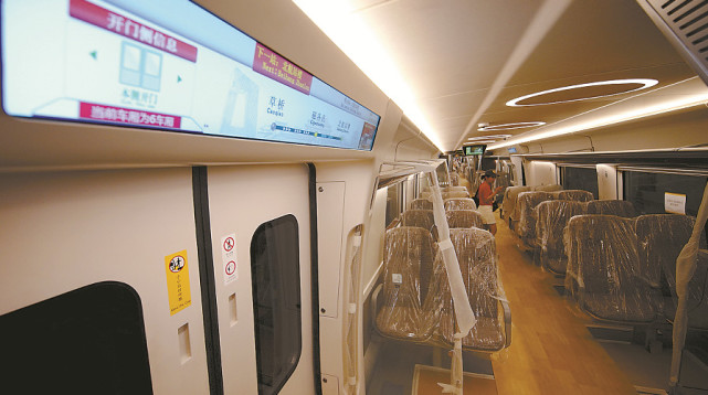 车厢设置同样与众不同。列车首次采用载客车厢+行李车厢设置的“6+1+1”编组形式,全列定员448人。其中,6节是普通车厢,按照“2+2”布局座椅;1节是商务车厢,按照“1+2”布局座椅;1节是行李车厢。在普通车厢,座椅前后间距达到0.84米,乘客坐下时腿前可放置一个小型行李箱;而在商务车厢,每个座椅都拥有独立可调控的出风口、阅读灯、USB接口。这样的配置,已经超过“复兴号”高铁动车组二等座和一等座要求。