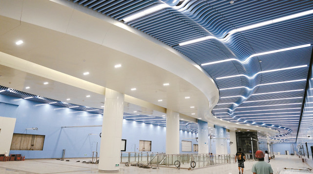 “为了打造出起伏的水波纹效果,吊顶采用铝板和方通有序组合做成双曲造型,每一块方通的尺寸都不一样。这些都增加了施工难度。”侯征介绍,磁各庄站以“海上丝绸之路”为设计主题,以船和水波纹为设计元素。为了增添灵动感,设计单位还在站内增加了9根通体蓝色的艺术装饰柱,柱子上还绘有流动的树叶。