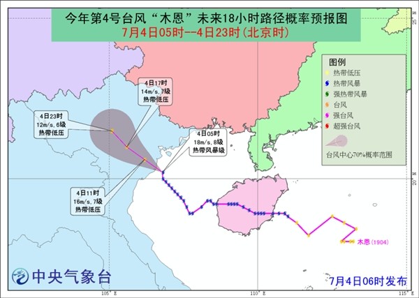 第4号台风“木恩”(热带风暴级)的中心今天(4日)早晨5点钟位于越南海防市偏南方约75公里的北部湾海面上,就是北纬20.2度、东经106.8度,中心附近最大风力有8级(18米/秒),中心最低气压为992百帕。