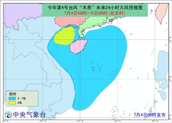中国天气网讯 中央气象台7月4 日06时继续发布台风蓝色预警: