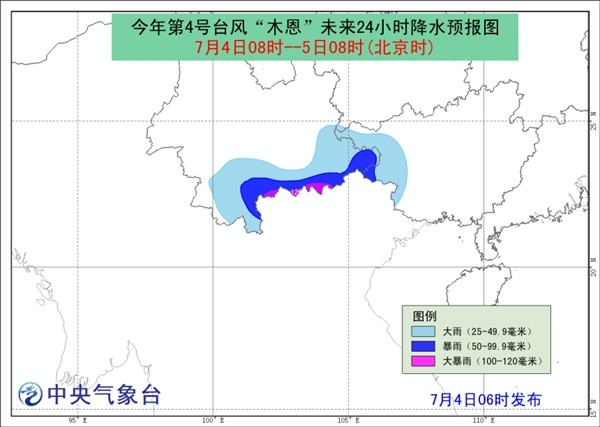 降水预报:7月4日08时至5日08时,广西西部和云南南部有大雨,部分地区有暴雨或大暴雨(50~120毫米)。