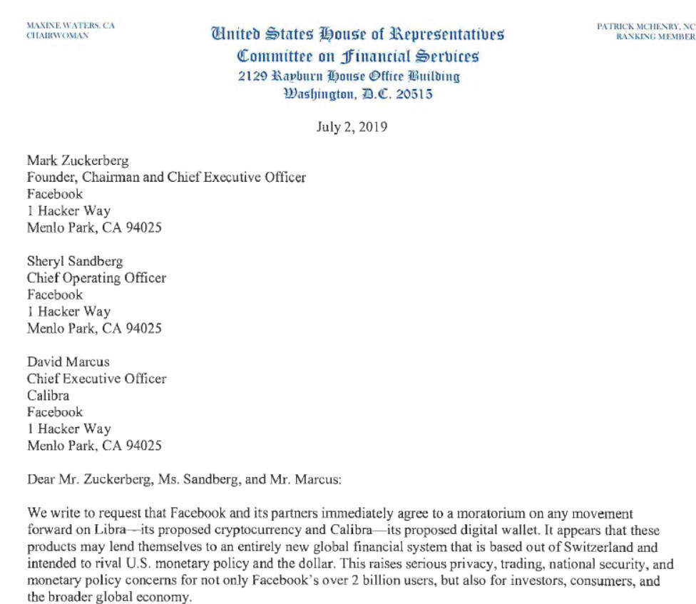 7月3日,据外媒报道,美国民主党委员会成员突然向扎克伯格等Facebook高管致函,要求其立即停止数字货币/钱包项目 Libra/CaLibra 的所有工作。