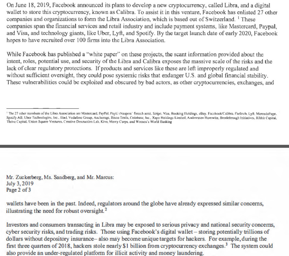 函件内容提及要求暂停Libra项目主要原因在于,Facebook发行的Libra不仅给Facebook超过20亿的用户带来了严重的隐私、交易、国家安全和货币政策方面的担忧,也会给投资者、消费者和更广泛的全球经济带来了担忧。