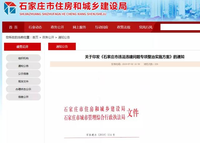 最新消息!石家庄市住房和城乡建设局发布《石家庄市违法违建问题专项整治实施方案》,对违法违规建设问题进行为期一年的专项整治。