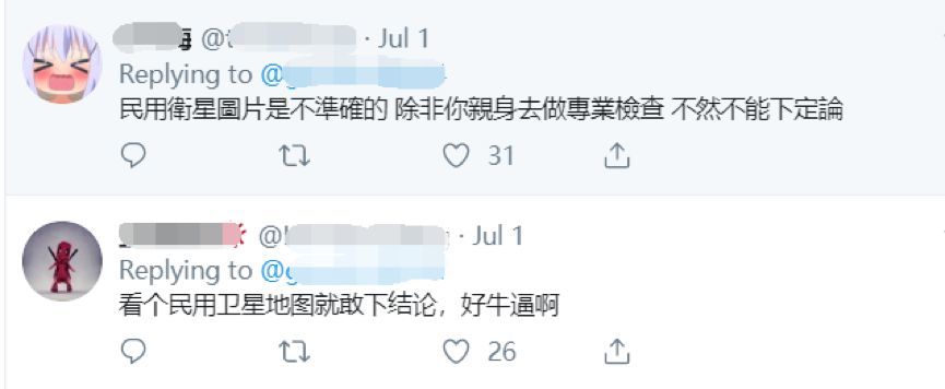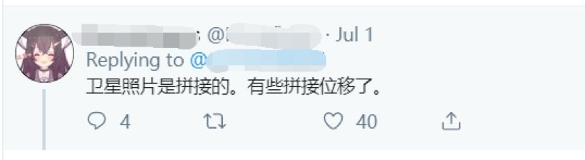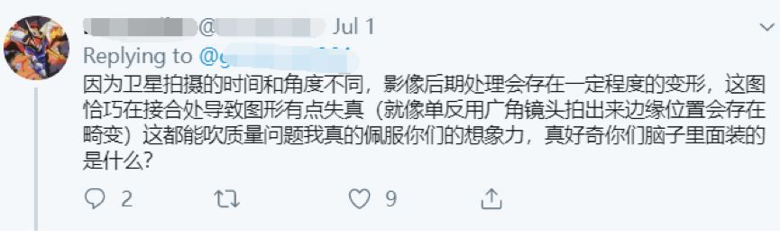 不过,这个谣言贴很快在境外就遭到了不少人的质疑。有人提出民用卫星图片的精确度、图片拍摄的角度和拼接成像时的算法,都会导致图像出现变形。