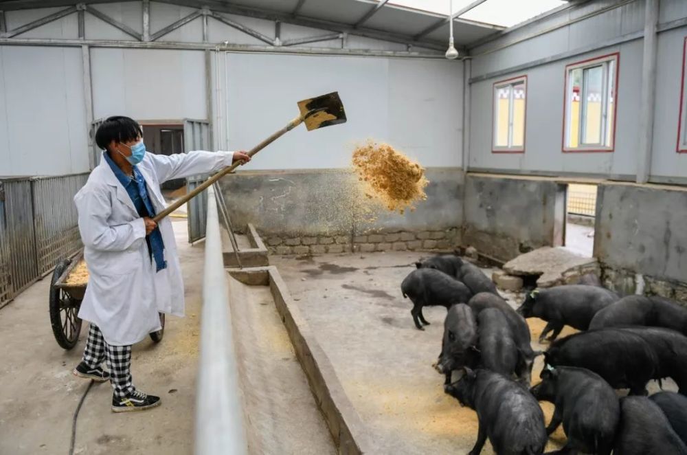 西藏林芝市工布江达县朱拉乡柳四朗村藏猪扩繁基地的工作人员桑旦顿珠在给藏猪喂饲料。新华社记者 刘东君 摄